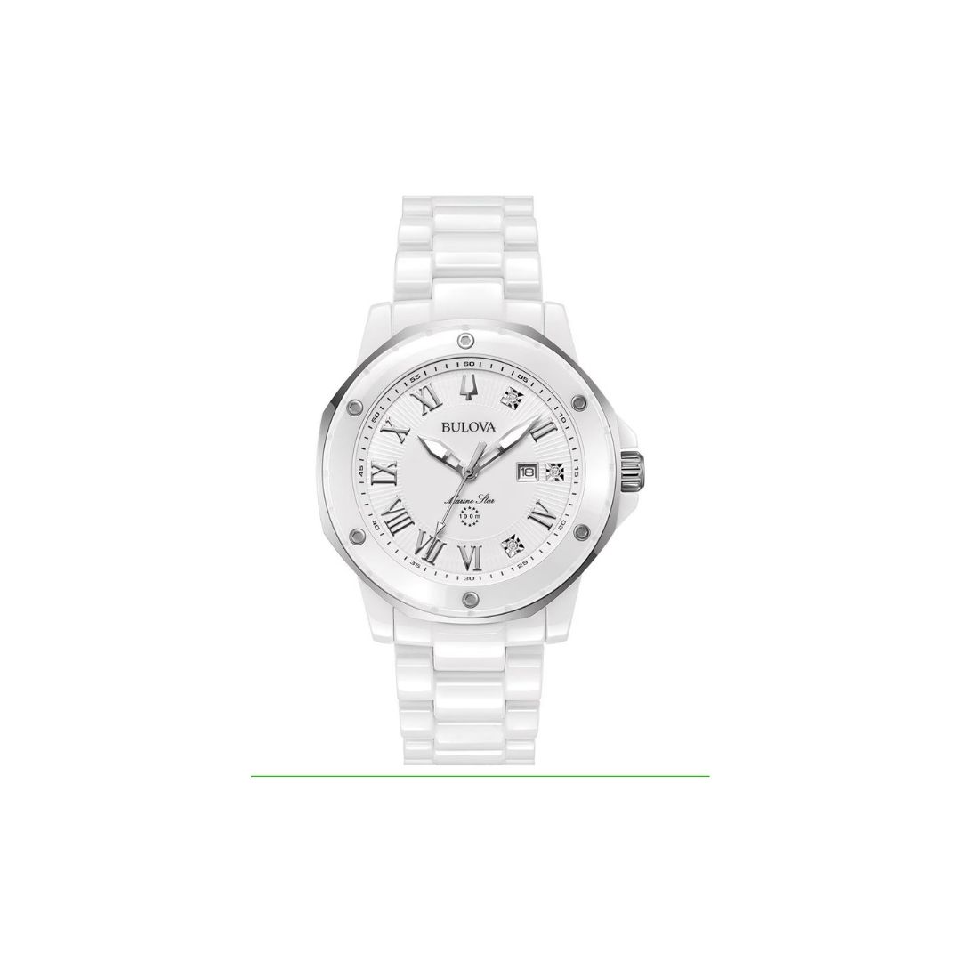 Reloj Bulova colección Marc Anthony “Marine Star” para mujer. Movimiento de cuarzo de 3 manecillas y fechador. Caja y brazaletes realizados en cerámica blanca, broche desplegable de doble pulsador. Carátula blanca texturizada, Cristal de zafiro con tratamiento antirreflejante. Resistencia al agua de hasta 100 metros