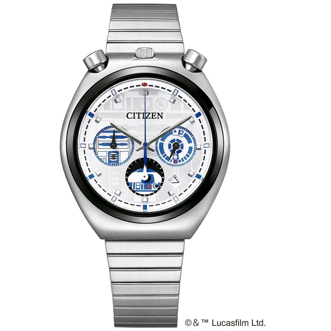 Citizen unisex colección Star Wars Tsunos R2D2 Edición Especial. Reloj de cuarzo con cronógrafo, Fechador. La caja de acero inoxidable en tono plateado refleja el diseño de R2-D2. Al igual que la esfera, que tiene un aspecto elevado que hace eco de sus paneles, y está acentuada con los distintivos detalles en azul y rojo. Hermeticidad de 5 ATM.