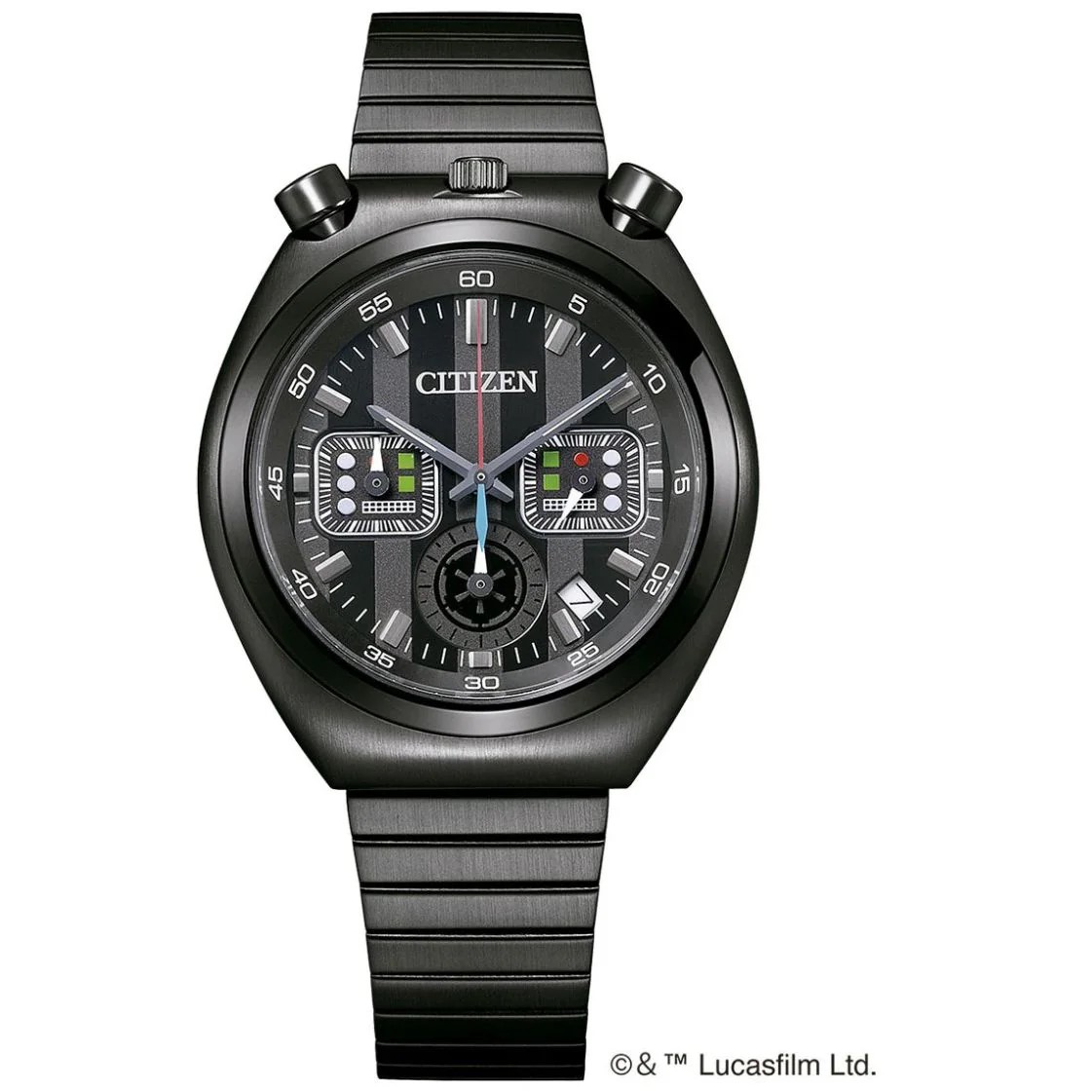 Citizen unisex colección Star Wars Tsunos Darth Vader Edición Especial. Reloj de cuarzo con cronógrafo, Fechador. El diseño detallado evoca la presencia de Darth Vader: los colores de las manecillas del cronógrafo hacen eco de su transformación y las subesferas presentan elementos de diseño verde y rojo inspirados en su icónica armadura. Hermeticidad de 5 ATM.