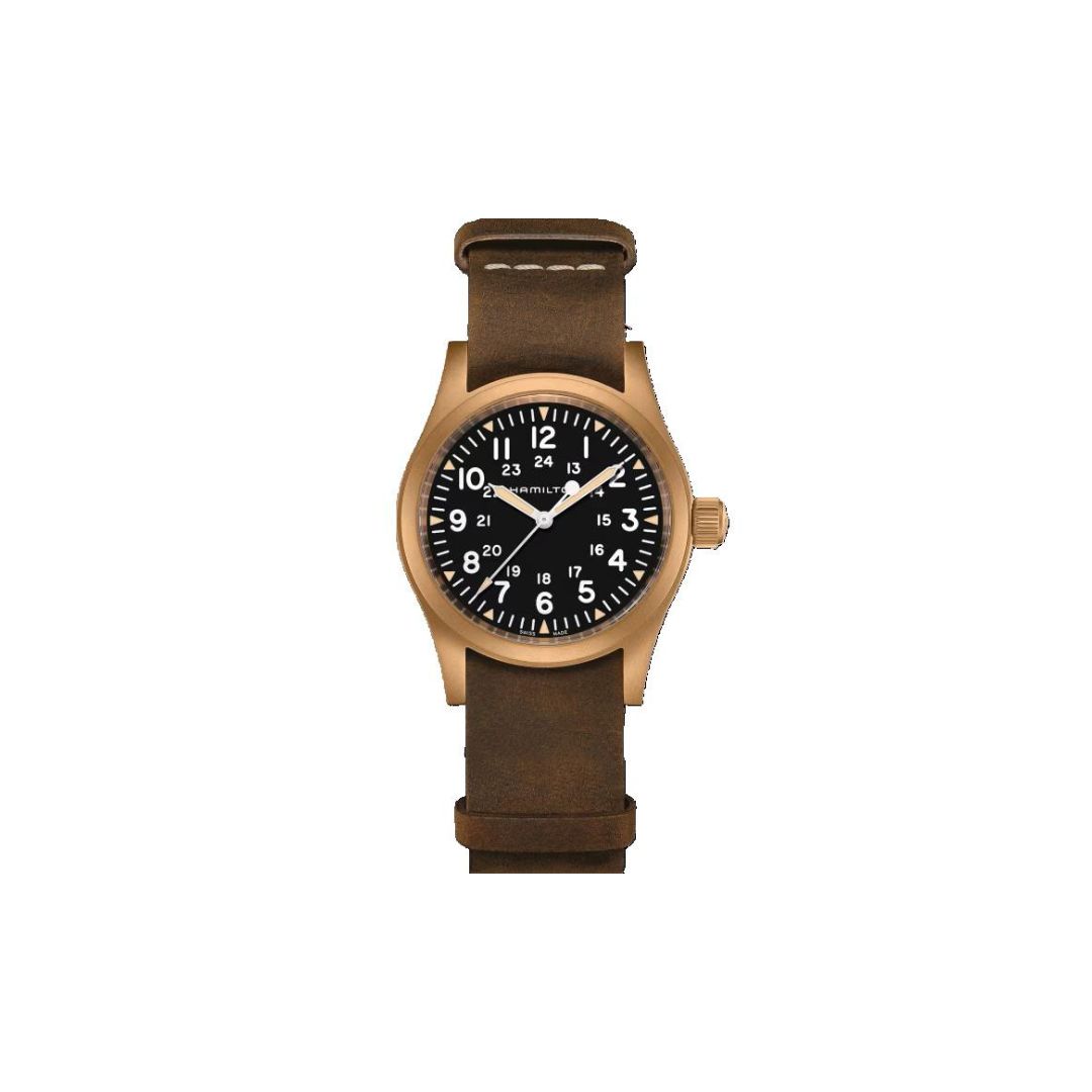 Reloj HAMILTON KHAKI FIELD MECHANICAL BRONZE, para Caballero, cristal de zafiro, caja en titanio con aleación en PVD color bronce, carátula en color negra. Diámetro 38 mm Movimiento Mecánico de cuerda manual con reserva de marcha de hasta 80 horas. Correa de Piel NATO en color café con hebilla estándar, Resistencia al agua 50 m