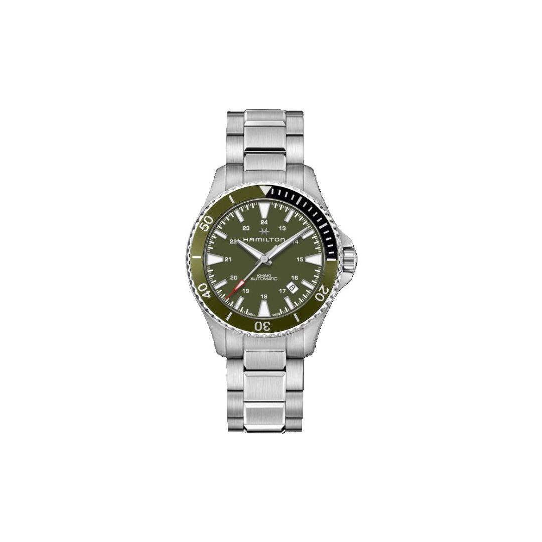Reloj HAMILTON KHAKI NAVY SCUBA para Caballero, cristal de zafiro, caja y extensible de acero inoxidable con corona de rosca. Carátula color verde con Índices Luminiscentes 3 Manecillas Diámetro 40 mm Movimiento Automático de Tres Agujas. Resistencia al Agua 100 m