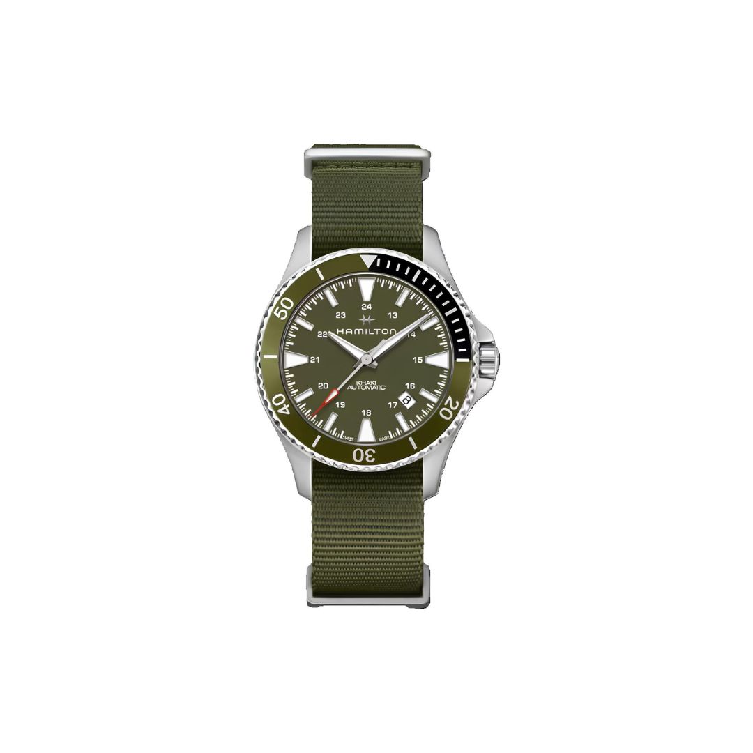 Reloj HAMILTON KHAKI NAVY SCUBA para Caballero, Cristal de Zafiro, Caja en Acero Inoxidable con Corona de Rosca. Carátula en Color Verde con Índices Luminiscentes 3 manecillas, diámetro 40 mm. Movimiento Automático de tres agujas. Correa de Naylon en Color Verde con Hebilla Estándar, resistencia al agua 100 m