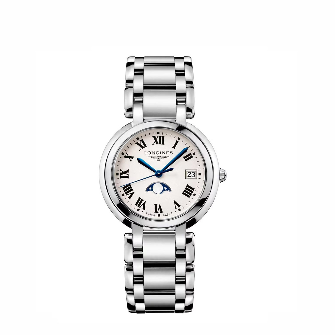 Reloj LONGINES Prima Luna para dama, cristal de zafiro, caja y extensible en acero inoxidable, carátula plateada con números romanos,  3 manecillas, diámetro 34 mm movimiento de cuarzo, broche con triple cierre, mecanismo de apertura mediante pulsador, indicador de fases de la luna, fechador, resistencia al agua 30 m
