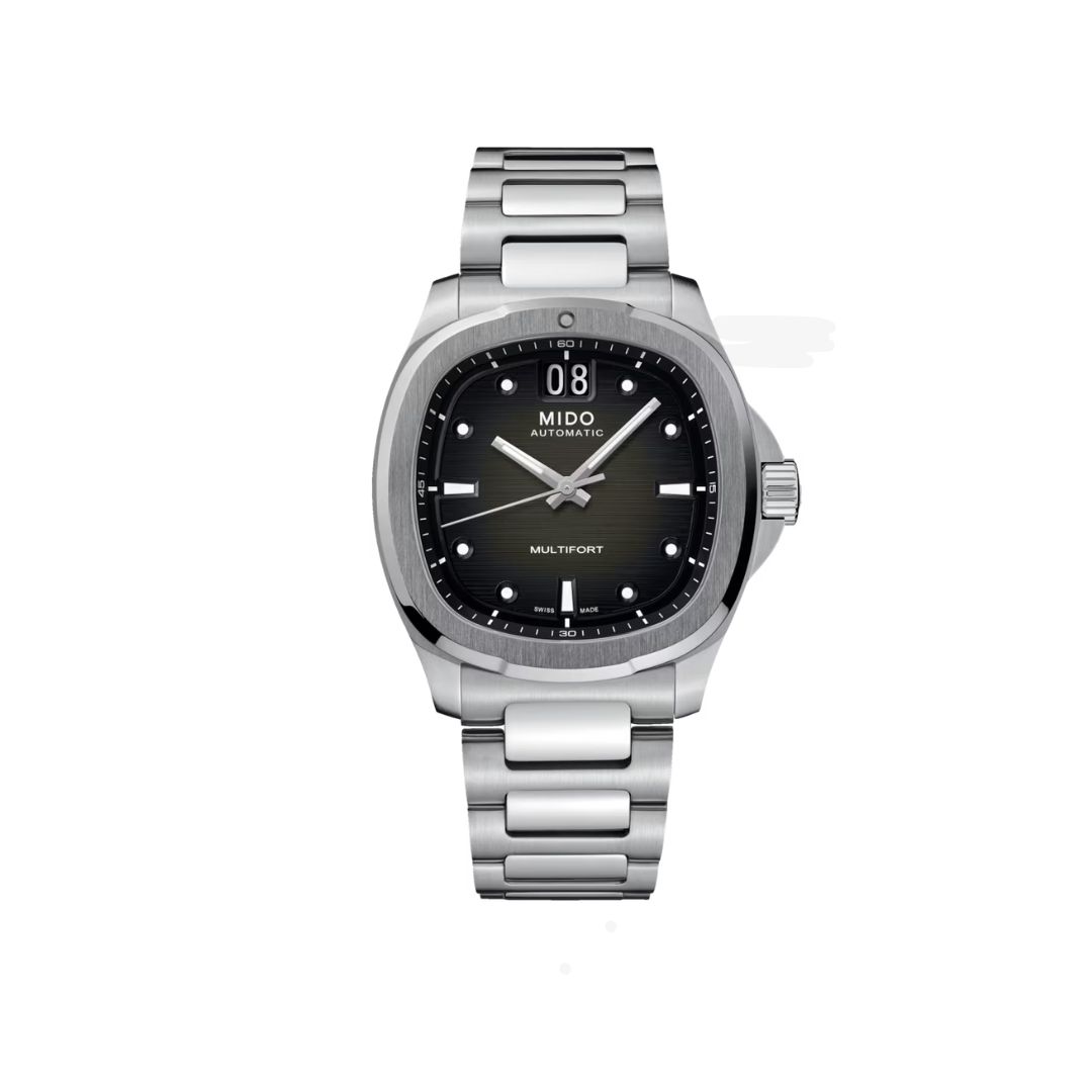 Reloj MIDO MULTIFORT TV BIG DATE para Caballero, Cristal Zafiro con Tratamiento Antirreflejante en Ambos Lados, Caja de Acero Inoxidable con Corona de Rosca, Forma Rectangular, Fondo de Caja Transparente, Caratula Degradado Gris, Indices Superluminova, Diámetro 40 mm Extensible en Acero Inoxidable con Broche Desplegable, Movimiento Automático ETA Mido, Reserva de Marcha de Hasta 80 Horas, Funciones: Gran fecha, Calibre 80 para el Big Date MIDO, Peso del Reloj 155g, Garantía por 2 Años, Resistencia al Agua 100 m